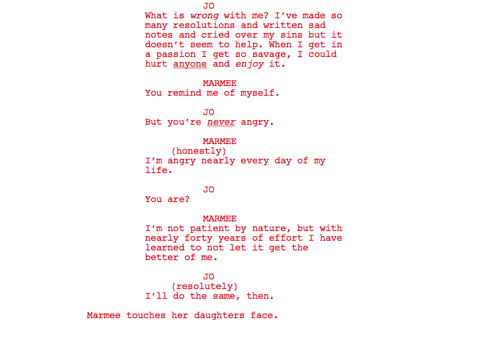 Sometimes patience isn’t about waiting, but rather, continuing on, even when it seems there’s not much to work with. That is what Marmee is onto. The trick is to use that restless energy, transfer it to something else and push on. After Beth dies, Jo, in another fit of passion and impulsivity, begins to burn all her old work. Page after page catch flame, she only stops when she sees a short story she wrote for Beth on the beach while she worked to try and get strength up.